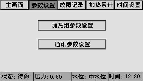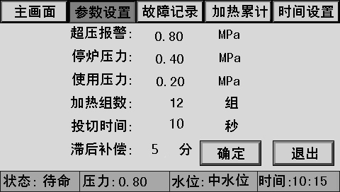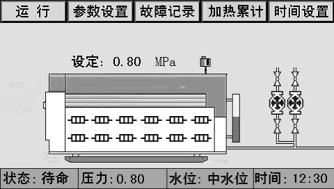 主畫面上同時顯示控制器狀態(tài)、系統(tǒng)壓力、水位、時間、燃燒器狀態(tài)、泵狀態(tài)等。